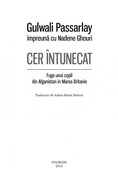 Comandă online cartea "Cer întunecat. Fuga unui copil din Afganistan în Marea Britanie" la 11,66 lei isbn 9789734626373 scrisă de Nadene Ghouri , Gulwali Passarlay, tiparită la editura Polirom face parte din colecția -. cu plata ramburs sau online cu cardul. Momentan titlul "Cer întunecat. Fuga unui copil din Afganistan în Marea Britanie" nu este disponibil însa vă puteți înscrie pentru a fi notificat în momenul reaprovizionarii.