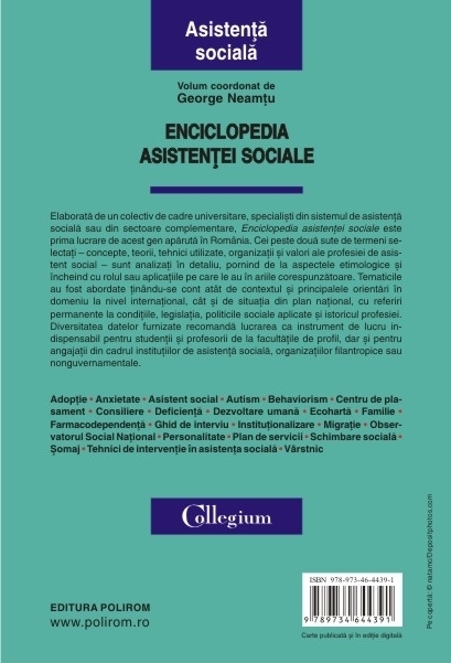 Elaborata de un colectiv de cadre universitare, specialisti din sistemul de asistenta sociala sau din sectoare complementare, Enciclopedia asistentei sociale este prima lucrare de acest gen aparuta in Romania. Cei peste doua sute de termeni selectati – concepte, teorii, tehnici utilizate, organizatii si valori ale profesiei de asistent social – sint analizati in detaliu, pornind de la aspectele etimologice si incheind cu rolul sau aplicatiile pe care le au in ariile corespunzatoare. Tematicile au fost abordate tinindu-se cont atit de contextul si principalele orientari in domeniu la nivel international, cit si de situatia din plan national, cu referiri permanente la conditiile, legislatia, politicile sociale aplicate si istoricul profesiei. Diversitatea datelor furnizate recomanda lucrarea ca instrument de lucru indispensabil pentru studentii si profesorii de la facultatile de profil, dar si pentru angajatii din cadrul institutiilor de asistenta sociala, organizatiilor filantropice sau nonguvernamentale.