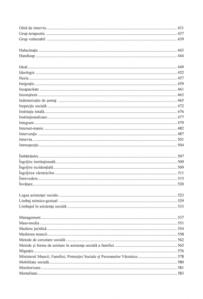 Adoptie • Anxietate • Asistent social • Autism • Behaviorism • Centru de plasament • Consiliere • Deficienta • Dezvoltare umana • Ecoharta • Familie • Farmacodependenta • Ghid de interviu • Institutionalizare • Migratie • Observatorul Social National • Personalitate • Plan de servicii • Schimbare sociala • Somaj • Tehnici de interventie in asistenta sociala • Virstnic