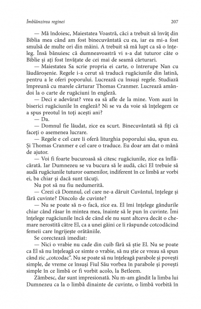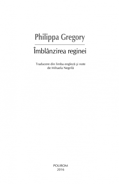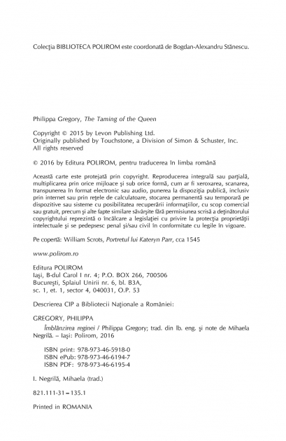 Traducere din limba engleza si note de Mihaela Negrila Autoarea bestsellerurilor Surorile Boleyn si Mostenirea Boleyn Imblinzirea reginei este povestea frumoasei Kateryn Parr, ultima sotie a regelui Henric al VIII-lea si una dintre cele mai complexe figuri feminine din Anglia secolului al XVI-lea. Ramasa vaduva pentru a doua oara la doar treizeci de ani, Kateryn este curtata de rege si trebuie sa-l accepte drept sot, caci cine ar refuza un suveran capricios, care are putere de viata si de moarte asupra intregii tari? Noua regina este nevoita sa isi invinga repulsia fata de acest barbat batrin si bolnav, sa faca fata intrigilor de la curte si, in acelasi timp, sa lupte pentru impunerea religiei anglicane. Odata cu trecerea timpului, Kateryn se dovedeste a fi mai puternica si mai inteligenta decit pare, iar personalitatea ei il cucereste treptat pe Henric. Insa ea trebuie sa-si ascunda adevarata iubire, fata de lordul Thomas Seymour, caci descoperirea acestei taine le-ar aduce amindurora moartea. Dragostea, credinta, simtul datoriei, teama si tandretea domina firea reginei erudite, care trebuie sa indure toanele unui rege crud si imprevizibil, inconjurat de curteni vicleni si uneltitori, intr-o epoca in care viata unei femei – fie ea si cea mai importanta femeie din regat – nu inseamna nimic, iar cea mai mica suspiciune poate aduce moartea. „Prin povestea superba a lui Kateryn Parr, regina care i-a supravietuit lui Henric al VIII-lea, Philippa Gregory continua istoria dinastiei Tudor. Autoarea descrie foarte amanuntit detaliile intime ale relatiei celor doi si vadeste o cunoastere profunda a tensiunilor religioase si politice din Anglia acelor vremuri.” (The Times) „Un roman doldora de detalii cuceritoare si strabatut de tensiunea necontenita ce stapineste o curte regala condusa de un nebun...” (Library Journal) „Portretele pe care le face Gregory monarhului imbatrinit si nestatornic, dar si sotiei sale erudite si senzuale ii vor incinta pe toti cei pasionati de istoria Tudorilor.” (Publishers Weekly)