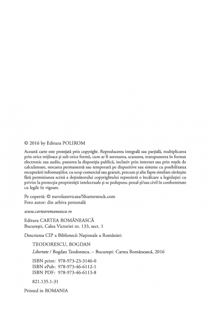 Comandă online cartea "Libertate" la 31,70 lei isbn 9789732331460 scrisă de Bogdan Teodorescu, tiparită la editura Polirom face parte din colecția Cartea romaneasca. cu plata ramburs sau online cu cardul. Momentan titlul "Libertate" nu este disponibil însa vă puteți înscrie pentru a fi notificat în momenul reaprovizionarii.