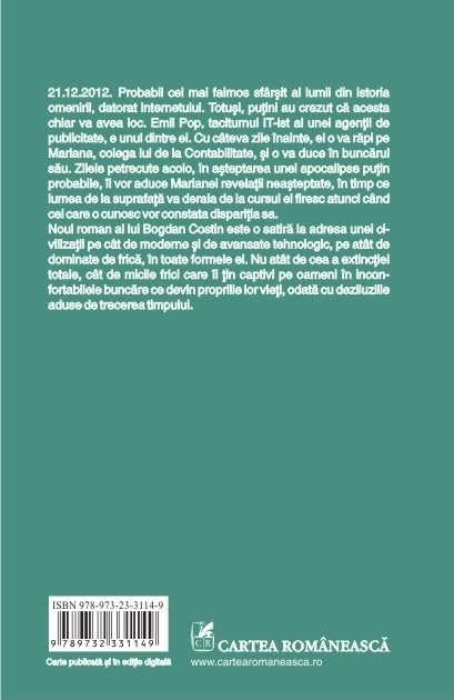 Noul roman al lui Bogdan Costin este o satira la adresa unei civilizatii pe cit de moderne si de avansate tehnologic, pe atit de dominate de frica, in toate formele ei. Nu atit de cea a extinctiei totale, cit de micile frici care ii tin captivi pe oameni in inconfortabilele buncare ce devin propriile lor vieti, odata cu deziluziile aduse de trecerea timpului.