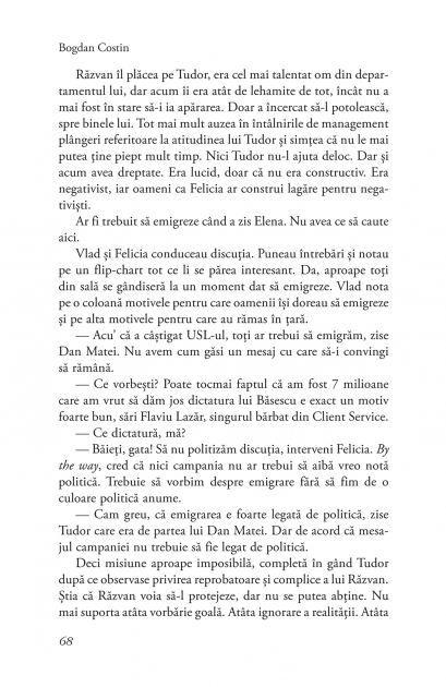 „Ambitia mea e sa scriu cea mai trista si mai comica poveste din lume. Nu cred ca mi-a iesit inca partea cu «din lume», nici cu «cea mai», dar o sa mai insist. Cartea de fata nu e despre sfirsitul lumii, ci despre cum continua ea sa existe, cu bune si rele, tinuta laolalta, ca sa nu se destrame, parca mai degraba de o frica omniprezenta decit de legile fizicii. Am incercat sa transpun in universul mic al unei agentii de publicitate problemele lumii contemporane, asa cum le resimt eu. (Bogdan Costin)