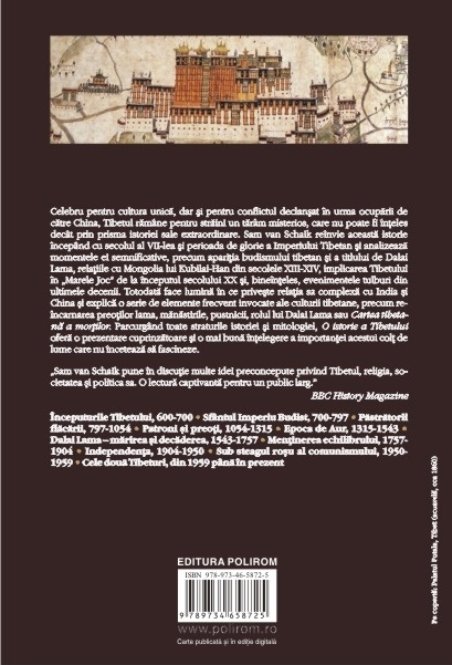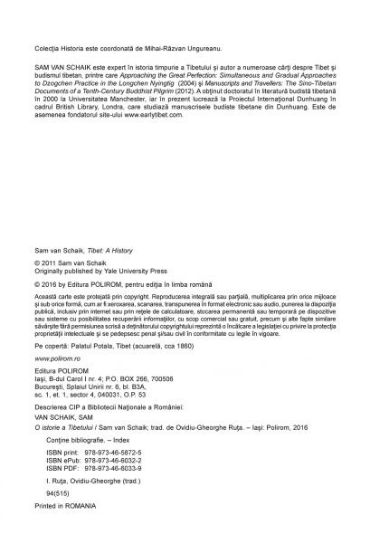 Celebru pentru cultura unica, dar si pentru conflictul declansat in urma ocuparii de catre China, Tibetul ramine pentru straini un tarim misterios, care nu poate fi inteles decit prin prisma istoriei sale extraordinare. Sam van Schaik reinvie aceasta istorie incepind cu secolul al VII-lea si perioada de glorie a Imperiului Tibetan si analizeaza momentele ei semnificative, precum aparitia budismului tibetan si a titlului de Dalai Lama, relatiile cu Mongolia lui Kubilai-Han din secolele XIII-XIV, implicarea Tibetului in „Marele Joc” de la inceputul secolului XX si, bineinteles, evenimentele tulburi din ultimele decenii. Totodata face lumina in ce priveste relatia sa complexa cu India si China si explica o serie de elemente frecvent invocate ale culturii tibetane, precum reincarnarea preotilor lama, manastirile, pustnicii, rolul lui Dalai Lama sau Cartea tibetana a mortilor. Parcurgind toate straturile istoriei si mitologiei, O istorie a Tibetului ofera o prezentare cuprinzatoare si o mai buna intelegere a importantei acestui colt de lume care nu inceteaza sa fascineze.