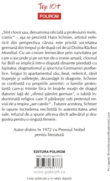 Traducere din limba germana de Petru Forna Autor distins in 1972 cu Premiul Nobel pentru literatura „Sint clovn sau, denumirea oficiala a profesiunii mele, comic” – asa se prezinta Hans Schnier, artistul nefericit din perspectiva caruia este privita societatea germana din timpul si de dupa cel de-al Doilea Razboi Mondial. Cu un cinism fermecator prin naivitatea pe care o ascunde si pe un ton de o ironie amara, clovnul lui Boll se implica intr-o disputa dinainte pierduta cu lasitatea, dogmatismul si ipocrizia Germaniei postbelice. Singur in apartamentul sau, beat, nefericit, ranit trupeste si sufleteste, dezamagit in dragoste, Schnier se confrunta cu propriile amintiri: o familie protestanta care-si trimite fiica in bratele mortii de dragul datoriei fata de „sfintul pamint german”, o iubita indoctrinata religios care il paraseste sub pretextul nevoii de a respira „aer catholic” . Tuturor acestora, Schnier le opune increderea neclintita in autenticitatea artei sale, refuzul de a spune altceva decit adevarul si dragostea pentru o singura femeie.