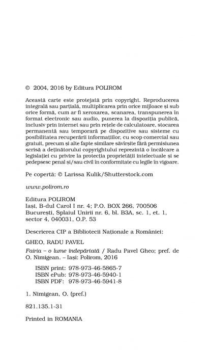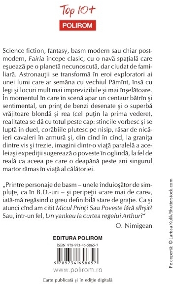 Editie revizuita Prefata de O. Nimigean Science fiction, fantasy, basm modern sau chiar post-modern, Fairia incepe clasic, cu o nava spatiala care esueaza pe o planeta necunoscuta, dar ciudat de familiara. Astronautii se transforma in eroi exploratori ai unei lumi care ar semana cu vechiul Pamint, insa cu legi si locuri mult mai imprevizibile si mai inselatoare. In momentul in care in scena apar un centaur batrin si sentimental, un print de benzi desenate si o superba vrajitoare blonda si rea (cel putin la prima vedere), realitatea se da cu totul peste cap: stincile vorbesc si se lupta in duel, corabiile plutesc pe nisip, rasar de nicaieri cavaleri in armura si, din cind in cind, la granita dintre vis si trezie, imagini dintr-o viata paralela a aceleiasi expeditii sugereaza o poveste in oglinda, la fel de reala ca aceea pe care o deapana peste ani singurul martor ramas in viata al calatoriei. „Printre personaje de basm – unele induiosator de simplute, ca in B.D.-uri – si peripetii «care mai de care», iata-ma regasind o greu definibila stare de gratie. Ca si atunci cind am citit Micul Print? Sau Povestea fara sfirsit? Sau, intr-un fel, Un yankeu la curtea regelui Arthur?” (O. Nimigean)