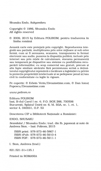 Comandă online cartea "Scandalul (ediţie de buzunar)" la 11,66 lei isbn 9789734658671 scrisă de Shusaku Endo, tiparită la editura Polirom face parte din colecția Top 10+. cu plata ramburs sau online cu cardul. Momentan titlul "Scandalul (ediţie de buzunar)" nu este disponibil însa vă puteți înscrie pentru a fi notificat în momenul reaprovizionarii.
