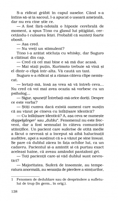 Traducere din limba japoneza si note de Andreea Sion La cei saizeci si cinci de ani ai lui, Suguro este apreciat de cititori, critici si colegi de breasla, desi exista voci care ii ironizeaza rigoarea morala si reticenta in privinta problemelor sexuale. Totul pare sa arate ca il asteapta o batrinete linistita alaturi de sotia sa, dar acest scenariu se spulbera in clipa in care o femeie il acuza ca felul cum traieste contrazice flagrant ideile pe care se intemeiaza scrierile sale, denuntindu-l drept un client asiduu al bordelurilor si sex-shopurilor din Tokyo. Amenintat de un ziarist razbunator cu declansarea unui adevarat scandal in presa, Suguro este nevoit sa dezlege misterul acestei acuzatii si descopera astfel existenta unui dublu al sau, un „geaman malefic” cu inclinatii sadomasochiste.