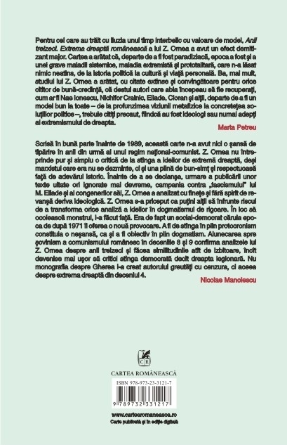„Pentru cei care au trait cu iluzia unui timp interbelic cu valoare de model, Anii treizeci. Extrema dreapta romaneasca a lui Z. Ornea a avut un efect demitizant major. Cartea a aratat ca, departe de a fi fost paradiziaca, epoca a fost si a unei grave maladii sistemice, maladia extremista si prototalitara, care n-a lasat nimic neatins, de la istoria politica la cultura si viata personala. Ba, mai mult, studiul lui Z. Ornea a aratat, cu citate extinse si convingatoare pentru orice cititor de buna-credinta, ca destui autori care abia incepeau sa fie recuperati, cum ar fi Nae Ionescu, Nichifor Crainic, Eliade, Cioran si altii, departe de a fi un model bun la toate – de la profunzimea viziunii metafizice la concretetea solutiilor politice –, trebuie cititi precaut, fiindca au fost ideologi sau numai adepti ai extremismului de dreapta.” (Marta Petreu)