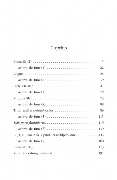Constantin, „orfan cu parinti”, cum se prezinta singur, renunta la viata lui confortabila din Romania si pleaca sa traiasca in Camarile, un soi de Cuba a fumatorilor, unde acestia – mai ales cei persecutati in tarile lor de bastina – primesc azil politic. De aici isi rememoreaza viata, de-a lungul careia marca tigarilor fumate se tot schimba odata cu femeile pe care le iubeste. Dar ironia sortii face ca el sa se indragosteasca nebuneste de o nefumatoare...