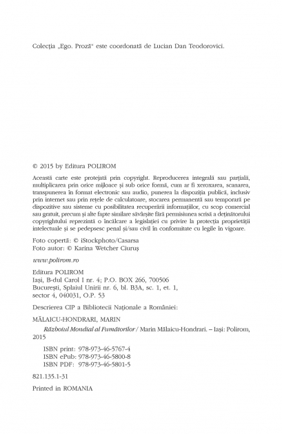 Comandă online cartea "Războiul Mondial al Fumătorilor" la 27,94 lei isbn 9789734657674 scrisă de Marin Mălaicu-Hondrari, tiparită la editura Polirom face parte din colecția Ego. Proza. cu plata ramburs sau online cu cardul. Momentan titlul "Războiul Mondial al Fumătorilor" nu este disponibil însa vă puteți înscrie pentru a fi notificat în momenul reaprovizionarii.