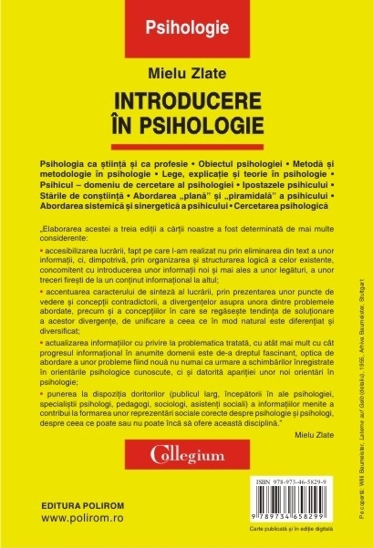„Elaborarea acestei a treia editii a cartii noastre a fost determinata de mai multe considerente: accesibilizarea lucrarii, fapt pe care l-am realizat nu prin eliminarea din text a unor informatii, ci, dimpotriva, prin organizarea si structurarea logica a celor existente, concomitent cu introducerea unor informatii noi si mai ales a unor legaturi, a unor treceri firesti de la un continut informational la altul; accentuarea caracterului de sinteza al lucrarii, prin prezentarea unor puncte de vedere si conceptii contradictorii, a divergentelor asupra unora dintre problemele abordate, precum si a conceptiilor in care se regaseste tendinta de solutionare a acestor divergente, de unificare a ceea ce in mod natural este diferentiat si diversificat; actualizarea informatiilor cu privire la problematica tratata, cu atit mai mult cu cit progresul informational in anumite domenii este de-a dreptul fascinant, optica de abordare a unor probleme fiind noua nu numai ca urmare a schimbarilor inregistrate in orientarile psihologice cunoscute, ci si datorita aparitiei unor noi orientari in psihologie; punerea la dispozitia doritorilor (publicul larg, incepatorii in ale psihologiei, specialistii psihologi, pedagogi, sociologi, asistenti sociali) a informatiilor menite a contribui la formarea unor reprezentari sociale corecte despre psihologie si psihologi, despre ceea ce poate sau nu poate inca sa ofere aceasta disciplina.” (Mielu Zlate)