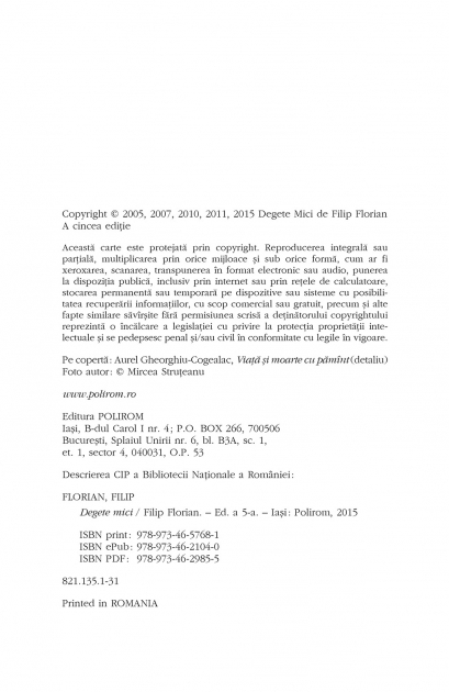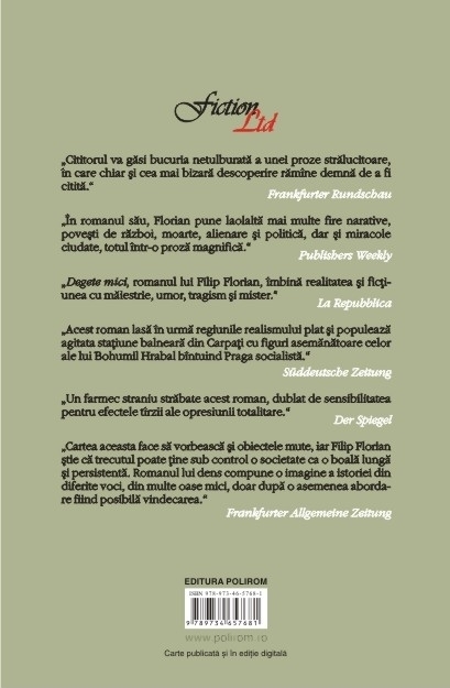 Comandă online cartea "Degete mici. Ediția a V-a" la 27,94 lei isbn 9789734657681 scrisă de Filip Florian, tiparită la editura Polirom face parte din colecția Fiction Ltd. cu plata ramburs sau online cu cardul. Momentan titlul "Degete mici. Ediția a V-a" nu este disponibil însa vă puteți înscrie pentru a fi notificat în momenul reaprovizionarii.