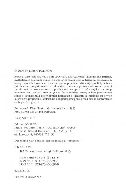 Acesta este „romanul” ultimului Caragiale, Mateiu. Un demers insolit, impletire de autentic, imaginatie si verosimil pe scena belle epoque a lumii dimbovitene. O lume urmarita atit din exteriorul, cit si din interiorul unui cuget aparte, cugetul „celui mai reactionar scriitor roman”. Personajul este unul cu totul special, semet, nonconformist, dificil de acceptat. Tinar, isi tese cu obstinatie modul de existenta si infatisarea de veritabil dandy, scandalizindu-si filistinii contemporani, in frunte cu celebrul sau tata. Matur, se izoleaza in tinuta si trufie, ajungind personalitatea cea mai ciudata a Bucurestiului interbelic. Devine, din bastardul „berarului” Caragiale, urmasul contilor transilvaneni pe care-i adoptase. Isi traieste ultimul deceniu in casa boieroaicei Marica Sion, cirpind mosia acesteia din Baragan, pe care se incapatineaza sa o transforme intr-o adevarata seniorie. Acum, prin toata fiinta, demonstreaza ceea ce dorise: noblesse, elegance, style. Aproape ca se rupe de vremea lui, vremea in care „alesii vulgului incep sa imbaloseze totul”. Tinjea dupa Romania dinainte de primul razboi, asa cum tinjesc unii dintre noi dupa Romania dinaintea celui de-al doilea.Comandă online cartea "M J C" la 10,60 lei isbn 9789734655298 scrisă de Ion Iovan, tiparită la editura Polirom face parte din colecția Fiction Ltd. cu plata ramburs sau online cu cardul. Momentan titlul "M J C" nu este disponibil însa vă puteți înscrie pentru a fi notificat în momenul reaprovizionarii.