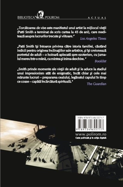 Traducere din limba engleza de Iuliana Dumitru Torcatoarea de vise este un lung poem in proza schitat pe marginea calatoriei initiatice a unui artist, de la primele mirari ale copilariei la cautarile tineretii, aduse laolalta si intretesute de privirea ordonatoare a femeii la maturitate. „Torcatoarea de vise este manifestul unui artist la mijlocul vietii (Patti Smith a terminat de scris cartea la 45 de ani), care mediteaza asupra lucrurilor trecute si viitoare.” (Los Angeles Times) „Patti Smith isi intoarce privirea catre istoria familiei, cautind indicii pentru originea inclinatiilor sale artistice, si isi creioneaza portretul de adult – o hoinara aplecata spre ezoterism, cu jurnalul mereu intr-o mina, cu mintea si inima deschise.” (Booklist) „Smith prinde momente ale vietii de adult si le aduce la stadiul unui impresionism atit de enigmatic, incit chiar si cele mai marunte lucruri – prepararea ceaiului, leganatul capului in timp ce coase – capata incarcatura spirituala.” (The Guardian) „Primul exemplar din Torcatoarea de vise i l-am oferit tatalui meu. Timpul trecea, iar el tot nu zicea nimic. Era un om frumos, greu de impresionat, asa ca abia daca am indraznit sa sper ca imi va citi textul. Totusi, citiva ani mai tirziu, la scurt timp inainte sa moara, mi-a spus: «Patricia, ti-am citit cartea». Ma asteptam sa primesc cine stie ce critici, nicidecum sa-l aud numind «carte» modestul meu dar. «Scrii bine», mi-a zis si m-a chemat sa bem o cafea. A fost singurul compliment pe care mi l-a facut vreodata. Am fost intrebata daca Torcatoarea de vise e un basm. Mereu am indragit povestile de felul asta, insa ma tem ca a mea nu le seamana. Tot ce contine aceasta carte este adevarul adevarat, redat intocmai. Scrierea ei m-a scos din starea aceea ciudata de apatie si sper ca il va umple cumva si pe cititor de o anume bucurie nelamurita si neasteptata.” (Patti Smith)