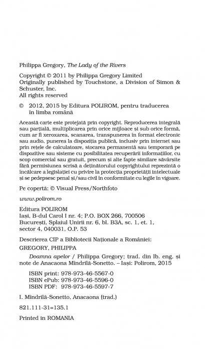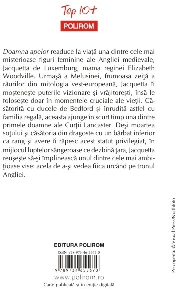 Traducere din limba engleza de Anacaona Mindrila‑Sonetto Philippa Gregory este cea mai importanta autoare de romane istorice din Marea Britanie, cunoscuta in lume datorita bestsellerurilor Surorile Boleyn si Mostenirea Boleyn. Doamna apelor readuce la viata una dintre cele mai misterioase figuri feminine ale Angliei medievale, Jacquetta de Luxemburg, mama reginei Elizabeth Woodville. Urmasa a Melusinei, frumoasa zeita a riurilor din mitologia vest-europeana, Jacquetta ii mosteneste puterile vizionare si vrajitoresti, insa le foloseste doar in momentele cruciale ale vietii. Casatorita cu ducele de Bedford si inrudita astfel cu familia regala, aceasta ajunge in scurt timp una dintre primele doamne ale Curtii Lancaster. Desi moartea sotului si casatoria din dragoste cu un barbat inferior ca rang si avere ii rapesc acest statut privilegiat, in mijlocul luptelor singeroase ce dezbina tara, Jacquetta reuseste sa-si implineasca unul dintre cele mai ambitioase vise: acela de a-si vedea fiica urcind pe tronul Angliei.