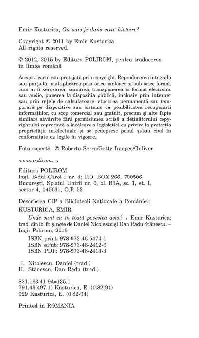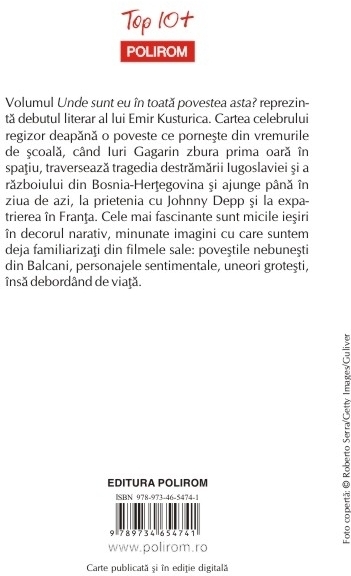 Traducere din limba franceza si note de Daniel Nicolescu si Dan Radu Stanescu Debutul literar al celebrului regizor sirb Emil Kusturica, o noua intilnire cu povestile si personajele sale pline de viata Volumul Unde sint eu in toata povestea asta? reprezinta debutul literar al lui Emir Kusturica. Cartea celebrului regizor deapana o poveste ce porneste din vremurile de scoala, cind Iuri Gagarin zbura prima oara in spatiu, traverseaza tragedia destramarii Iugoslaviei si a razboiului din Bosnia-Hertegovina si ajunge pina in ziua de azi, la prietenia cu Johnny Depp si la expatrierea in Franta. Cele mai fascinante sint micile iesiri in decorul narativ, minunate imagini cu care sintem deja familiarizati din filmele sale: povestile nebunesti din Balcani, personajele sentimentale, uneori grotesti, insa debordind de viata.