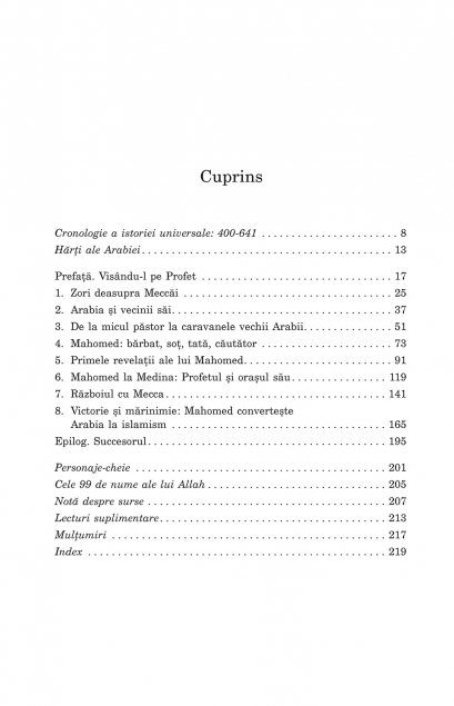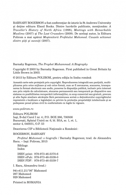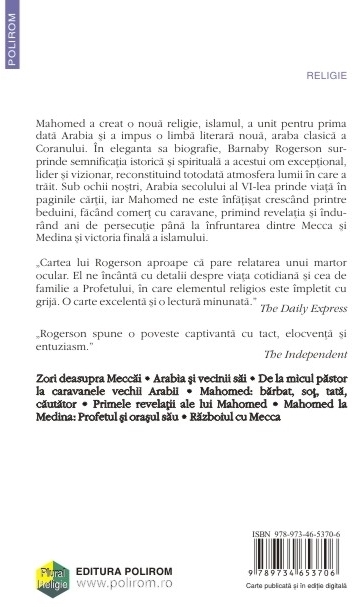 Traducere de Alexandru Racu Barnaby Rogerson este autorul volumului Mostenitorii Profetului Mahomed. Cauzele schismei dintre siiti si suniti, o reconstituire captivanta a vietii lui Mahomed si a primilor patru califi. Mahomed a creat o noua religie, islamul, a unit pentru prima data Arabia si a impus o limba literara noua, araba clasica a Coranului. In eleganta sa biografie, Barnaby Rogerson surprinde semnificatia istorica si spirituala a acestui om exceptional, lider si vizionar, reconstituind totodata atmosfera lumii in care a trait. Sub ochii nostri, Arabia secolului al VI-lea prinde viata in paginile cartii, iar Mahomed ne este infatisat crescind printre beduini, facind comert cu caravane, primind revelatia si indurind ani de persecutie pina la infruntarea dintre Mecca si Medina si victoria finala a islamului. „Cartea lui Rogerson aproape ca pare relatarea unui martor ocular. El ne incinta cu detalii despre viata cotidiana si cea de familie a Profetului, in care elementul religios este impletit cu grija. O carte excelenta si o lectura minunata.” (The Daily Express) „Rogerson spune o poveste captivanta cu tact, elocventa si entuziasm.” (The Independent) Din cuprins: Zori deasupra Meccai • Arabia si vecinii sai • De la micul pastor la caravanele vechii Arabii • Mahomed: barbat, sot, tata, cautator • Primele revelatii ale lui Mahomed • Mahomed la Medina: Profetul si orasul sau • Razboiul cu Mecca