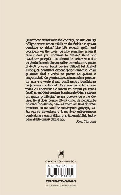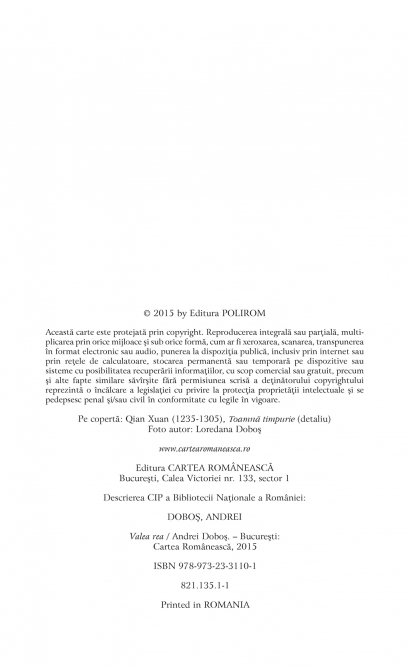 Valea Rea, cel de-al treilea volum de versuri al lui Andrei Dobos, este o explorare lirica a punctelor de conjunctie: intre confesiv si elegiac, intre observatie si evocare, istorie si prezenta. Poemele angajeaza o voce proaspat-contemporana in cautarea transparentei, numai pentru a realiza ca obiectele ce pot fi gasite se livreaza mereu sub semnul inclasabilului. La limita povestii, de cele mai multe ori mergind impotriva ei, la limita memoriei si impotriva ei, poemele livreaza figurile scaparatoare ale trecerii si mizeaza pe o vedere fara plasa de siguranta. „Toponimic, Valea rea imprima o identitate spatiala precisa: abundenta vegetala si minerala – salbaticia – a unui anume loc. Colateral muncii si inventiei, acest loc este necunoscut, cu atit mai mult cu cit el apare pe harta. Aici aveau sa alunge stramosii nostri duhurile necurate in ritualurile lor de exorcizare. Aici, psalmistul avea sa gaseasca o metafora pentru lumea-mortii. In vagauna si repezis, in incilceala de plante semi-parazite si muschi, sub umbrele grele de umezeala ale peretilor de calcar, povestea se sterge. Dislocarea nu lasa urme, dar ceva din miscarea de destramare a legaturilor mai poate fi inginat: dansul paianjenilor de apa deasupra peliculei fine, bluza ei parfumata de lina, copii prajind porumb la focul de tabara la sfirsitul verii. Poemele de fata reprezinta zgura acestor stergeri.” (Andrei Dobos) „«Like those sundays in the country, be that quality of light, warm when it falls on the fields,/ may you continue to shine/ like life reveals spells and blossoms on the trees, be like sunshine when it rains,/ may you continue to dream/ shine on» (Anthony Joseph) – ca ultimul lui volum m-a dus cu gindul la melodia versurilor de mai sus nu poate fi decit o veste buna pentru cititorii lui Andrei Dobos; ca densitatea experientelor transcrise, chiar si atunci cind e vorba de gusturi ori gesturi, e responsabila de plenitudinea si atmosfera poemelor sale e o veste si mai buna pentru bunastarea pietei noastre editoriale. Care sint lucrurile ce conteaza cu adevarat? Ce facem cu timpul pe care-l (mai) avem? Mai credem in miracole? Mai e natura un spatiu privilegiat? Avem puterea de a ne detasa, fie si doar pentru citeva clipe, de necazurile noastre? Indraznim, oare, sa avem o ultima dorinta? Presarata cu tot soiul de neasteptate gingasii, Valea rea se dovedeste a fi nu doar tulburatoarea confesiune a unui calator, ci si itinerariul liric indispensabil fiecaruia dintre noi.” (Alex Ciorogar)