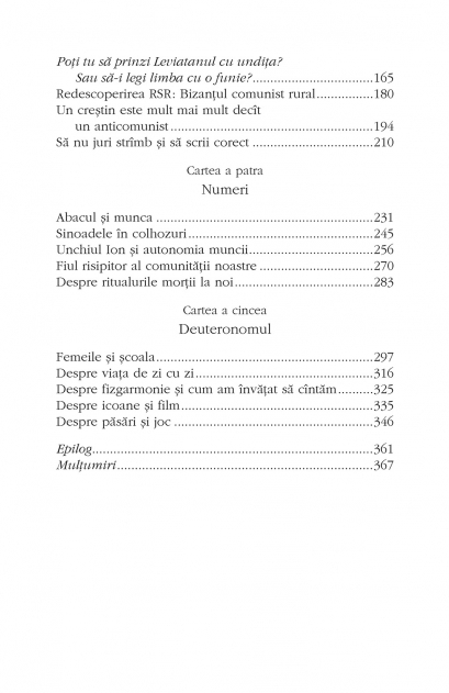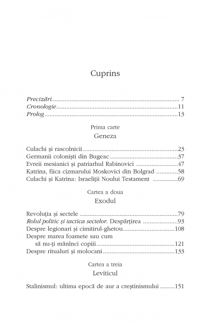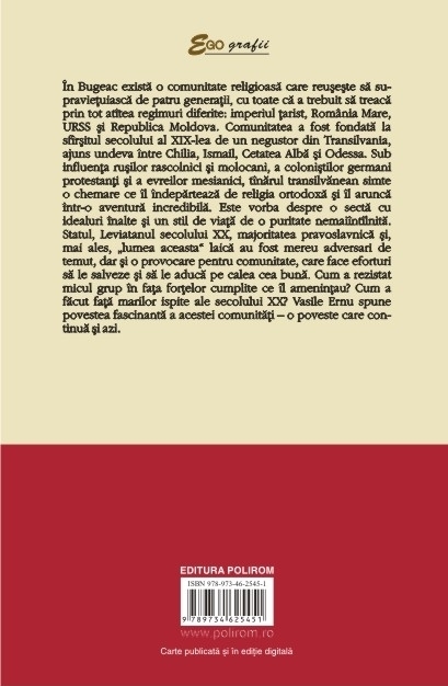 In Bugeac exista o comunitate religioasa care reuseste sa supravietuiasca de patru generatii, cu toate ca a trebuit sa treaca prin tot atitea regimuri diferite: imperiul tarist, Romania Mare, URSS si Republica Moldova. Comunitatea a fost fondata la sfirsitul secolului al XIX-lea de un negustor din Transilvania, ajuns undeva intre Chilia, Ismail, Cetatea Alba si Odessa. Sub influenta rusilor rascolnici si molocani, a colonistilor germani protestanti si a evreilor mesianici, tinarul transilvanean simte o chemare ce il indeparteaza de religia ortodoxa si il arunca intr-o aventura incredibila. Este vorba despre o secta cu idealuri inalte si un stil de viata de o puritate nemaiintilnita. Statul, Leviatanul secolului XX, majoritatea pravoslavnica si, mai ales, „lumea aceasta” laica au fost mereu adversari de temut, dar si o provocare pentru comunitate, care face eforturi sa le salveze si sa le aduca pe calea cea buna. Cum a rezistat micul grup in fata fortelor cumplite ce il amenintau? Cum a facut fata marilor ispite ale secolului XX? Vasile Ernu spune povestea fascinanta a acestei comunitati – o poveste care continua si azi. „Da, sint sectant, pentru ca asa ne-a botezat Cezarul, asa ne strigau dregatorii si carturarii «lumii acesteia», asa ne etichetau majoritarii pravoslavnici. Da, sint «oaia neagra» a unei secte radicale si marginale. Sint la a patra generatie de sectanti care de-a lungul a peste o suta de ani au trait in Bugeacul Basarabiei, in patru tari diferite, chiar daca nu ne-am mutat prea mult. Am trait sub atitea regimuri si dregatorii intr-un veac, incit le-am uitat numele. Ei insa nu ne-au uitat si ne-au numit mereu cu ura si dispret: sectanti. In cele ce urmeaza va voi marturisi – atit cit am aflat si mi s-a spus, atit cit stiu si eu din experienta directa –Tora sau Pentateuhul sectei mele. Sa pornim la drum, in fata ne asteapta stepa Bugeacului si Cartile lui Moise repovestite prin istoria familiei si comunitatii mele: Geneza, Exodul, Leviticul, Numerii si Deuteronomul.”