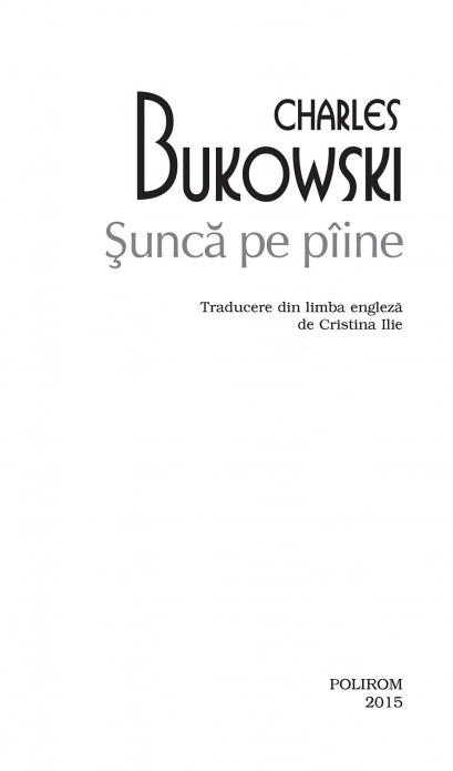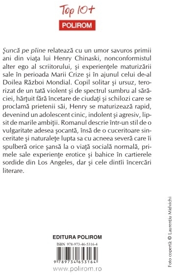 Traducere din limba engleza de Cristina Ilie Sunca pe piine relateaza cu un umor savuros primii ani din viata lui Henry Chinaski, nonconformistul alter ego al scriitorului, si experientele maturizarii sale in perioada Marii Crize si in ajunul celui de-al Doilea Razboi Mondial. Copil solitar si ursuz, terorizat de un tata violent si de spectrul sumbru al saraciei, hartuit fara incetare de ciudati si schilozi care se proclama prietenii sai, Henry se maturizeaza rapid, devenind un adolescent cinic, indolent si agresiv, lipsit de marile ambitii. Romanul descrie intr-un stil de o vulgaritate adesea socanta, insa de o cuceritoare sinceritate si naturalete lupta sa cu acneea severa care ii spulbera orice sansa la o viata sociala normala, primele sale experiente erotice si bahice in cartierele sordide din Los Angeles, dar si cele dintii incercari literare.