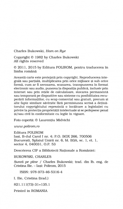Comandă online cartea "Şuncă pe pâine (ediţie de buzunar)" la 26,73 lei isbn 9789734653164 scrisă de Charles Bukowski, tiparită la editura Polirom face parte din colecția Top 10+. cu plata ramburs sau online cu cardul. Momentan titlul "Şuncă pe pâine (ediţie de buzunar)" nu este disponibil însa vă puteți înscrie pentru a fi notificat în momenul reaprovizionarii.