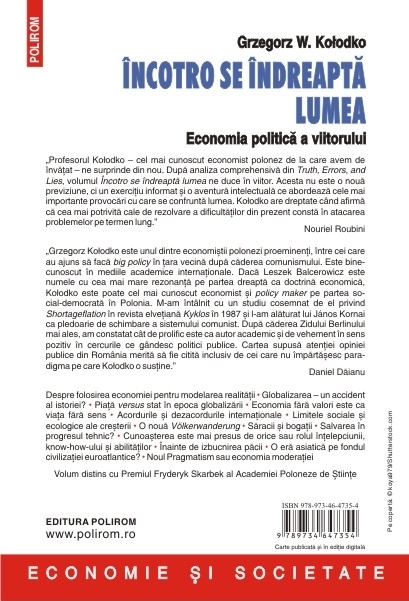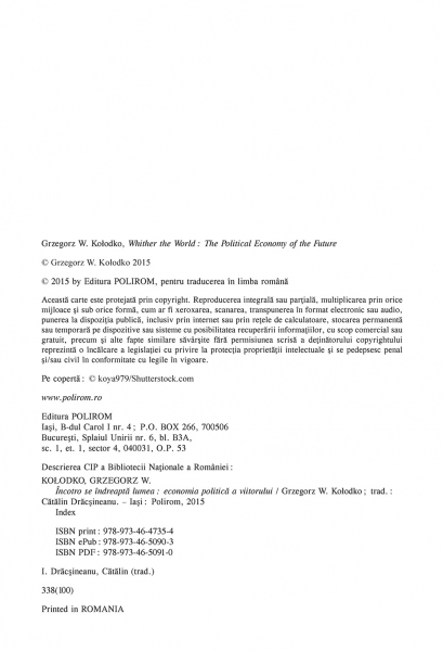 Traducere de Catalin Dracsineanu Volum distins cu Premiul Fryderyk Skarbek al Academiei Poloneze de Stiinte „Profesorul Kolodko – cel mai cunoscut economist polonez de la care avem de invatat – ne surprinde din nou. Dupa analiza comprehensiva din Truth, Errors, and Lies, volumul Incotro se indreapta lumea ne duce in viitor. Acesta nu este o noua previziune, ci un exercitiu informat si o aventura intelectuala ce abordeaza cele mai importante provocari cu care se confrunta lumea. Kolodko are dreptate cind afirma ca cea mai potrivita cale de rezolvare a dificultatilor din prezent consta in atacarea problemelor pe termen lung.” (Nouriel Roubini) „Grzegorz Kolodko este unul dintre economistii polonezi proeminenti, intre cei care au ajuns sa faca big policy in tara vecina dupa caderea comunismului. Este bine-cunoscut in mediile academice internationale. Daca Leszek Balcerowicz este numele cu cea mai mare rezonanta pe partea dreapta ca doctrina economica, Kolodko este poate cel mai cunoscut economist si policy maker pe partea social-democrata in Polonia. M-am intilnit cu un studiu consemnat de el privind Shortageflation in revista elvetiana Kyklos in 1987 si l-am alaturat lui Janos Kornai ca pledoarie de schimbare a sistemului comunist. Dupa caderea Zidului Berlinului mai ales, am constatat cit de prolific este ca autor academic si de vehement in sens pozitiv in cercurile ce gindesc politici publice. Cartea supusa atentiei opiniei publice din Romania merita sa fie citita inclusiv de cei care nu impartasesc paradigma pe care Kolodko o sustine.” (Daniel Daianu) Din cuprins: Despre folosirea economiei pentru modelarea realitatii • Globalizarea – un accident al istoriei? • Piata versus stat in epoca globalizarii • Economia fara valori este ca viata fara sens • Acordurile si dezacordurile internationale • Limitele sociale si ecologice ale cresterii • O noua Völkerwanderung • Saracii si bogatii • Salvarea in progresul tehnic? • Cunoasterea este mai presus de orice sau rolul intelepciunii, know-how-ului si abilitatilor • Inainte de izbucnirea pacii • O era asiatica pe fondul civilizatiei euroatlantice? • Noul Pragmatism sau economia moderatiei