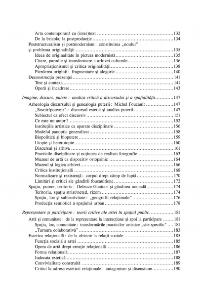 Imagine, societate si ideologie: teoria social-critica a artelor vizuale • Imaginea-ecran: teorii psihanalitice ale artei si reprezentarii vizuale • Imagine si semn: teorii structuraliste ale artelor si reprezentarii vizuale • Imagine si text: teorii post-structuraliste ale artelor si reprezentarii vizuale • Imagine, discurs, putere: analiza critica a discursului si a spatialitatii • Estetica relationala: de la obiecte la relatii sociale • Estetica dialogica: arta, comunicare si comunitate • Globalizare si reprezentare a identitatii: teoria postcoloniala a artelor vizuale