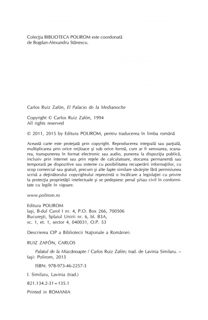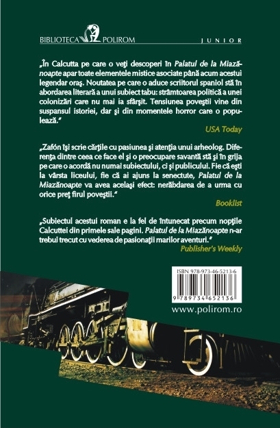 Autorul bestsellerului international Umbra vintului Plasata in Calcutta, in anii ’30 ai secolului trecut, actiunea romanului Palatul de la Miazanoapte debuteaza intr-o noapte intunecoasa, cind un tinar locotenent englez incearca sa salveze doi gemeni abia veniti pe lume de o amenintare inimaginabila. In ciuda vremii ingrozitoare si a pericolului teribil care pindeste la fiecare colt de strada, locotenentul reuseste sa-i aduca la adapost, insa cu pretul propriei vieti. Multi ani mai tirziu, in ajunul zilei de nastere a celor doi gemeni, amenintarea misterioasa revine in vietile lor. Acesta e subiectul unuia din primele romane ale lui Carlos Ruiz Zafon, o istorie fantezista, indrazneata si scrisa cu un mare talent de povestitor. „In Calcutta pe care o veti descoperi in Palatul de la Miazanoapte apar toate elementele mistice asociate pina acum acestui legendar oras. Noutatea pe care o aduce scriitorul spaniol sta in abordarea literara a unui subiect tabu: strimtoarea politica a unei colonizari care nu mai ia sfirsit. Tensiunea povestii vine din suspansul istoriei, dar si din momentele horror care o populeaza.” (USA Today) „Zafon isi scrie cartile cu pasiunea si atentia unui arheolog. Diferenta dintre ceea ce face el si o preocupare savanta sta si in grija pe care o acorda nu numai subiectului, ci si publicului. Fie ca esti la virsta liceului, fie ca ai ajuns la senectute, Palatul de la Miazanoapte va avea acelasi efect: nerabdarea de a urma cu orice pret firul povestii.” (Booklist) „Subiectul acestui roman e la fel de intunecat precum noptile Calcuttei din primele sale pagini. Palatul de la Miazanoapte n-ar trebui trecut cu vederea de pasionatii marilor aventuri.” (Publisher’s Weekly)Comandă online cartea "Palatul de la Miazănoapte" la 30,50 lei isbn 9789734652136 scrisă de Carlos Ruiz Zafón, tiparită la editura Polirom face parte din colecția BIBLIOTECA POLIROM -> Junior. cu plata ramburs sau online cu cardul. Momentan titlul "Palatul de la Miazănoapte" nu este disponibil însa vă puteți înscrie pentru a fi notificat în momenul reaprovizionarii.
