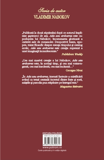 Traducere din limba engleza de Horia Florian Popescu „Publicat la doua saptamini dupa ce autorul implinise saptezeci de ani, Ada sau ardoarea este capodopera lui Nabokov, incununarea glorioasa a carierei sale de romancier. Deopotriva basm, epopee, tratat filosofic despre esenta timpului si catalog erotic, Ada sau ardoarea este creatia suprema a unei imaginatii incandescente.” (Publishers Weekly) „Cea mai masiva creatie a lui Nabokov, Ada sau ardoarea este, in acelasi timp, si cea mai extravaganta, cea mai insolenta, cea mai incitanta…” (Georges Nivat) „In Ada sau ardoarea, imensa fantezie a mistificarii avind ca tema centrala incestul dintre frate si sora, mastile si parodia pun stapinire pe intregul text.” (Magazine litteraire)