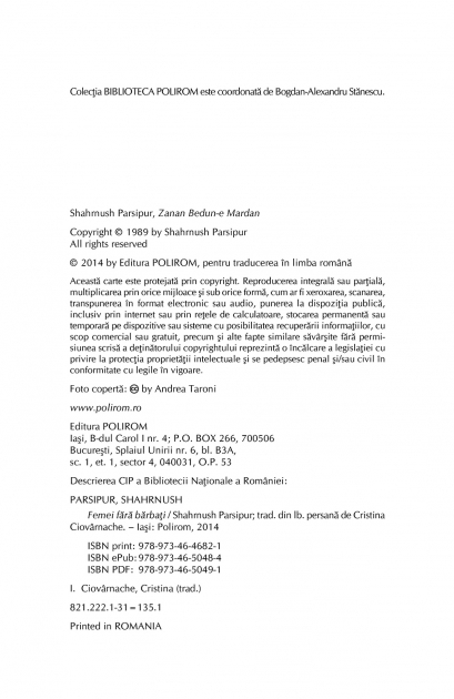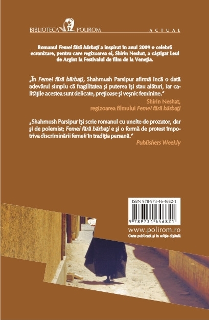 Traducere din limba persana de Cristina Ciovarnache O capodopera a literaturii contemporane, o carte interzisa de cenzura iraniana Romanul Femei fara barbati a inspirat in anul 2009 o celebra ecranizare, pentru care regizoarea ei, Shirin Neshat, a cistigat Leul de Argint la Festivalul de film de la Venetia.