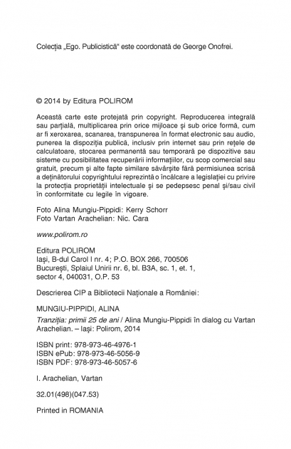 2014 este anul care marcheaza un sfert de secol de cind a cazut Zidul Berlinului, iar romanii au rasturnat regimul lui Nicolae Ceausescu. Ce ne-au adus acesti 25 de ani de libertate? In zece convorbiri spumoase, cu rol de diagnostic si totodata de profetie, Alina Mungiu-Pippidi si Vartan Arachelian discuta despre motivele pentru care comunismul romanesc a plantat saminta unei tranzitii dificile, daca a fost revolutie sau lovitura de stat, de ce la noi nu a existat lustratie si cum am putea sa ne maximizam performanta in UE. Traseul parcurs de autorii cartii in arheologia lor evenimentiala are multe similitudini, dar si deosebiri, ceea ce particularizeaza memoria colectiva in istorii personale. Desi aceasta carte e o istorie obiectiva a tranzitiei, ea este, nu doar in subtext, si o istorie traita. „In aceasta carte, va propun sa urmarim linia sinuoasa a tranzitiei, sa vedem de unde am plecat si unde sintem. Cartea aceasta o vad nu doar ca o cronica obiectiva, ci si ca o ilustrare subiectiva, reflectia tranzitiei in viata profesorului de tranzitie Alina Mungiu-Pippidi. Tranzitia Romaniei, dar si tranzitia Alinei.” (Vartan Arachelian) „Am cea mai inalta apreciere pentru Alina Mungiu-Pippidi. Ce a facut atit ca universitar, cit si ca activist pentru buna guvernare o plaseaza printre cei mai remarcabili oameni din regiune si in rindul elitei academice internationale.” (Thomas Carothers, Carnegie Endowment, autor al lucrarii The End of Transition Paradigm, 2010) „Alina Mungiu-Pippidi este una dintre cele mai curajoase si mai transparente figuri publice din Romania. E un critic transant, dar constructiv al realitatilor sociale si politice.” (Dennis Deletant, Georgetown University, 2010)