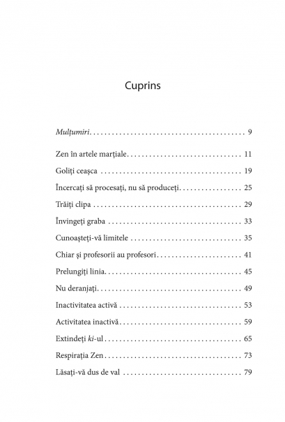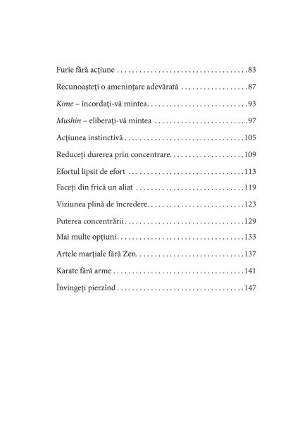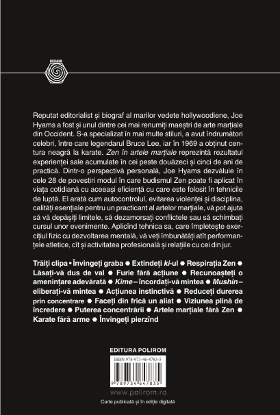 Fotografii de Kenneth McGowan si Doug Coder Traducere de Neculai Amalinei Reputat editorialist si biograf al marilor vedete hollywoodiene, Joe Hyams a fost si unul dintre cei mai renumiti maestri de arte martiale din Occident. S-a specializat in mai multe stiluri, a avut indrumatori celebri, intre care legendarul Bruce Lee, iar in 1969 a obtinut centura neagra la karate. Zen in artele martiale reprezinta rezultatul experientei sale acumulate in cei peste douazeci si cinci de ani de practica. Dintr-o perspectiva personala, Joe Hyams dezvaluie in cele 28 de povestiri modul in care budismul Zen poate fi aplicat in viata cotidiana cu aceeasi eficienta cu care este folosit in tehnicile de lupta. El arata cum autocontrolul, evitarea violentei si disciplina, calitati esentiale pentru un practicant al artelor martiale, va pot ajuta sa va depasiti limitele, sa dezamorsati conflictele sau sa schimbati cursul unor evenimente. Aplicind tehnica sa, care impleteste exercitiul fizic cu dezvoltarea mentala, va veti imbunatati atit performantele atletice, cit si activitatea profesionala si relatiile cu cei din jur. Din cuprins: Traiti clipa • Invingeti graba • Extindeti ki-ul • Respiratia Zen • Lasati-va dus de val • Furie fara actiune • Recunoasteti o amenintare adevarata • Kime – incordati-va mintea • Mushin – eliberati-va mintea • Actiunea instinctiva • Reduceti durerea prin concentrare • Faceti din frica un aliat • Viziunea plina de incredere • Puterea concentrarii • Artele martiale fara Zen • Karate fara arme • Invingeti pierzind