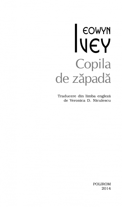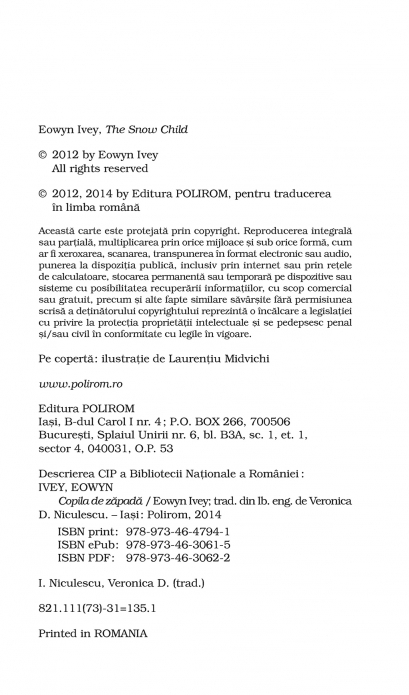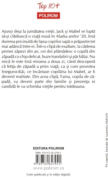 Comandă online cartea "Copila de zăpadă (ediţie de buzunar)" isbn 9789734647941 scrisă de Eowyn Ivey, tiparită la editura Polirom face parte din colecția Top 10+. cu plata ramburs sau online cu cardul. Momentan titlul "Copila de zăpadă (ediţie de buzunar)" nu este disponibil însa vă puteți înscrie pentru a fi notificat în momenul reaprovizionarii.