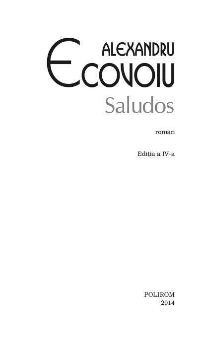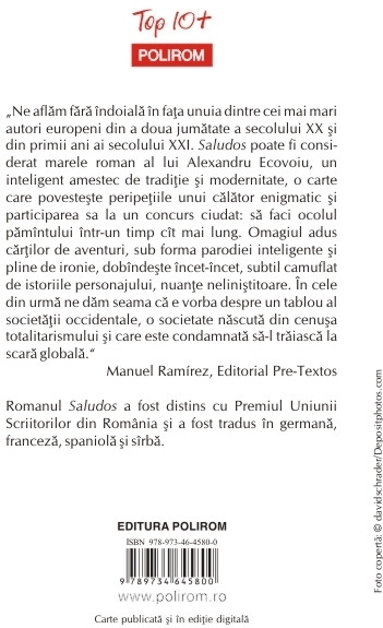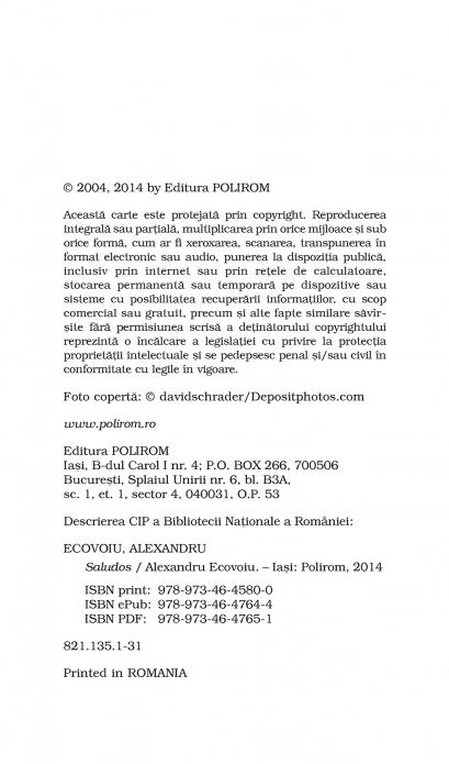 Comandă online cartea "Saludos (Editia 2014, Top 10+)" la 15,20 lei isbn 9789734645800 scrisă de Alexandru Ecovoiu, tiparită la editura Polirom face parte din colecția Top 10+. Cartea poate fi livrată în circa 2 zile cu plata ramburs sau online cu cardul.