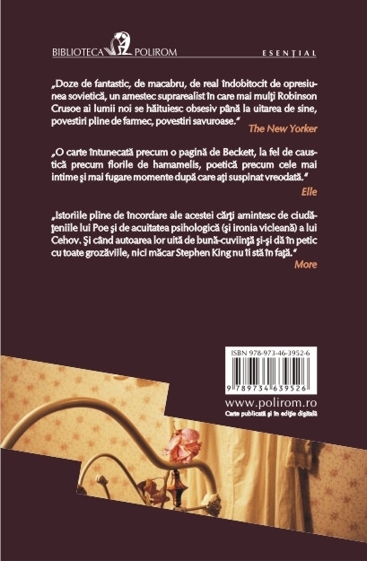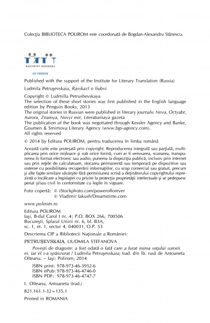 Traducere din limba rusa de Antoaneta Olteanu In povestirile ei ciudate, cu intorsaturi dintre cele mai neasteptate, Ludmila Petrusevskaia isi duce personajele prin apartamente sordide ale epocii comuniste, le pune sa traiasca amoruri fugare, de weekend clandestin, le impinge la suste prin birouri cooperatiste, la ocheade scolaresti, la tandreti patimase si nebunii terifiante. Sirete, dulci, cu picioarele pe pamint sau sublime prin nebunia lor, aceste Povesti de dragoste din care parca lipseste ceva amesteca umorul negru cu macabrul spectaculos, marcat, atunci cind totul pare pierdut, de surprinzatoare momente de gratie. „Doze de fantastic, de macabru, de real indobitocit de opresiunea sovietica, un amestec suprarealist in care mai multi Robinson Crusoe ai lumii noi se haituiesc obsesiv pina la uitarea de sine, povestiri pline de farmec, povestiri savuroase.” (The New Yorker) „O carte intunecata precum o pagina de Beckett, la fel de caustica precum florile de hamamelis, poetica precum cele mai intime si mai fugare momente dupa care ati suspinat vreodata.” (Elle) „Istoriile pline de incordare ale acestei carti amintesc de ciudateniile lui Poe si de acuitatea psihologica (si ironia vicleana) a lui Cehov. Si cind autoarea lor uita de buna-cuviinta si-si da in petic cu toate grozaviile, nici macar Stephen King nu ii sta in fata.” (More) Carte recomandata de