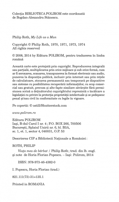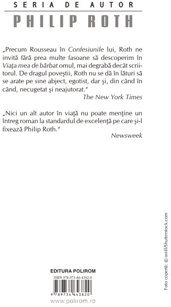 Traducere din limba engleza si note de Horia Florian Popescu Traducere si note revizuite de Nadia Brunstein „Precum Rousseau in Confesiunile lui, Roth ne invita fara prea multe fasoane sa descoperim in Viata mea de barbat omul, mai degraba decit scriitorul. De dragul povestii, Roth nu se da in laturi sa se arate pe sine abject, egotist, dar si, din cind in cind, necugetat si neajutorat.” (The New York Times) „Nici un alt autor in viata nu poate mentine un intreg roman la standardul de excelenta pe care si-l fixeaza Philip Roth.” (Newsweek)