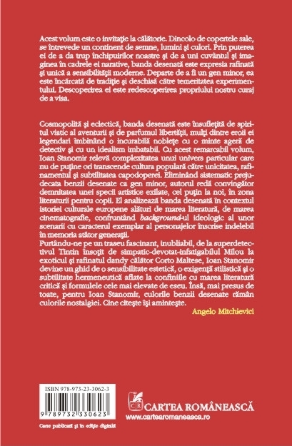 Acest volum este o invitatie la calatorie. Dincolo de copertele sale, se intrevede un continent de semne, lumini si culori. Prin puterea ei de a da trup inchipuirilor noastre si de a uni cuvintul si imaginea in cadrele ei narative, banda desenata este expresia rafinata si unica a sensibilitatii moderne. Departe de a fi un gen minor, ea este incarcata de traditie si deschisa catre temeritatea experimentului. Descoperirea ei este redescoperirea propriului nostru curaj de a visa. „Cosmopolita si eclectica, banda desenata este insufletita de spiritul viatic al aventurii si de parfumul libertatii, multi dintre eroii ei legendari imbinind o incurabila noblete cu o minte agera de detectiv si cu un idealism imbatabil. Cu acest remarcabil volum, Ioan Stanomir releva complexitatea unui univers particular care nu de putine ori transcende cultura populara catre unicitatea, rafinamentul si subtilitatea capodoperei. Eliminind sistematic prejudecata benzii desenate ca gen minor, autorul reda convingator demnitatea unei specii artistice exilate, cel putin la noi, in zona literaturii pentru copii. El analizeaza banda desenata in contextul istoriei culturale europene alaturi de marea literatura, de marea cinematografie, confruntind background-ul ideologic al unor scenarii cu caracterul exemplar al personajelor inscrise indelebil in memoria atitor generatii. Purtindu-ne pe un traseu fascinant, inubliabil, de la superdetectivul Tintin insotit de simpatic-devotat-infatigabilul Milou la exoticul si rafinatul dandy calator Corto Maltese, Ioan Stanomir devine un ghid de o sensibilitate estetica, o exigenta stilistica si o subtilitate hermeneutica aflate la confiniile cu marea literatura critica si formulele cele mai elevate de eseu. Insa, mai presus de toate, pentru Ioan Stanomir, culorile benzii desenate ramin culorile nostalgiei. Cine citeste isi aminteste.” (Angelo Mitchievici)