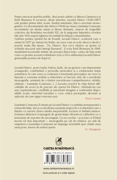 „Leonid Dimov, poet ciudat, bufon, ludic, de un grotesc care imprumuta avangardei, combinind o prozodie monodica si o exuberanta risipa semantica, la care ceea ce conteaza e luxurianta perceptiei, iar ceea ce lipseste e coerenta realista a obiectelor, se bucura, iata, de o excelenta monografie, semnata de o tinara cercetatoare comprehensiva, subtila, rafinata – Luminita Corneanu. Aceasta rezolva in chip fericit dificultatile de acces si de parcurs ale operei lui Dimov, oferindu-ne cea mai cuprinzatoare, credibila si autorizata imagine a scriitorului disponibila acum, relevind totodata o voce critica proaspata, decenta si aplicata, de care sigur vom mai auzi.” (Paul Cornea)