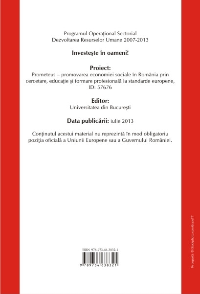 Programul Operational Sectorial Dezvoltarea Resurselor Umane 2007-2013 Investeste in oameni! Proiect: Prometeus – promovarea economiei sociale in Romania prin cercetare, educatie si formare profesionala la standarde europene, ID: 57676 Editor: Universitatea din Bucuresti Data publicarii: iulie 2013 Continutul acestui material nu reprezinta in mod obligatoriu pozitia oficiala a Uniunii Europene sau a Guvernului Romaniei.