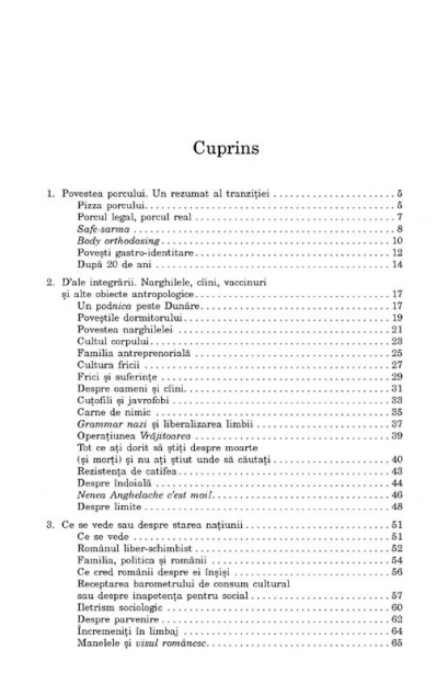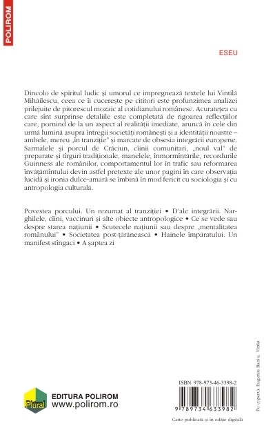 Dincolo de spiritul ludic si umorul ce impregneaza textele lui Vintila Mihailescu, ceea ce ii cucereste pe cititori este profunzimea analizei prilejuite de pitorescul mozaic al cotidianului romanesc. Acuratetea cu care sint surprinse detaliile este completata de rigoarea reflectiilor care, pornind de la un aspect al realitatii imediate, arunca in cele din urma lumina asupra intregii societati romanesti si a identitatii noastre – ambele, mereu „in tranzitie” si marcate de obsesia integrarii europene. Sarmalele si porcul de Craciun, ciinii comunitari, „noul val” de preparate si tirguri traditionale, manelele, inmormintarile, recordurile Guinness ale romanilor, comportamentul lor in trafic sau reformarea invatamintului devin astfel pretexte ale unor pagini in care observatia lucida si ironia dulce-amara se imbina in mod fericit cu sociologia si cu antropologia culturala.