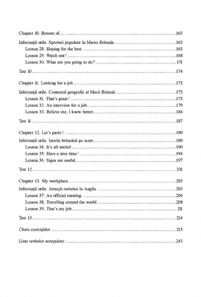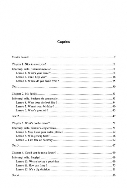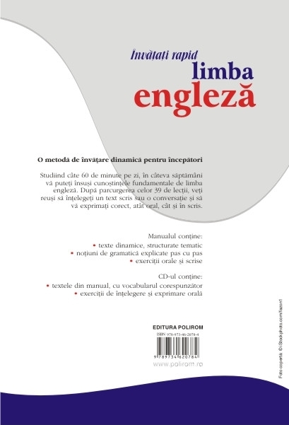 O metoda de invatare dinamica pentru incepatori Studiind cite 60 de minute pe zi, in citeva saptamini va puteti insusi cunostintele fundamentale de limba engleza. Dupa parcurgerea celor 39 de lectii, veti reusi sa intelegeti un text scris sau o conversatie si sa va exprimati corect, atit oral, cit si in scris. Manualul contine: • texte dinamice, structurate tematic • notiuni de gramatica explicate pas cu pas • exercitii orale si scrise CD-ul contine: • textele din manual, cu vocabularul corespunzator • exercitii de intelegere si exprimare orala