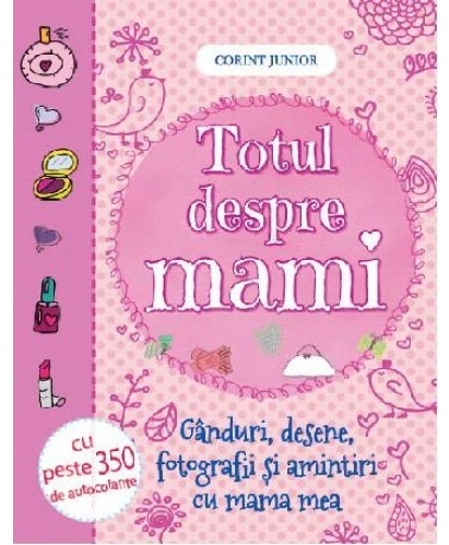 Cartea conține peste 350 de autocolanteCartea perfectă în care să notezi totul despre mama ta —exprimându-te prin scris, desene, fotografii și autocolante!Scrie despre vacanța mamei tale, fă o listă cu felurile ei de mâncare preferate, găsește o poșetă elegantă pentru ea printre autocolante și multe, multe altele!