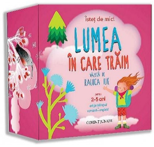 Cutia conține 5 cărticele bilingve ● română-englezăVremea • În natură • Universul • În oraș • În vacanță Lumea în care trăim este o excelentă ocazie pentru cei mici de a se familiariza mai bine cu lucrurile, locurile și fenomenele meteorologice. Cele cinci cărticele din această cutie conțin ilustrații originale, cu personaje prietenoase, care îi vor introduce pe micuți într-o lume a învățăturii, cu ajutorul textului bilingv.Desenele îi invită pe copii să pună întrebări, le dezvoltă curiozitatea și interesul pentru ceea ce se petrece în jurul lor sau peste mări și țări – de la parcul din cartier la vacanțele exotice.