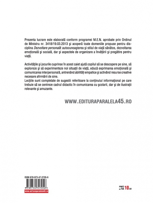 Activitățile și jocurile cuprinse în acest caiet ajută copilul să se descopere pe sine, să exploreze si să experimenteze noi situații de viață, educă exprimarea emoțională și comunicarea interpersonală, antrenând abilități empatice și activând resurse creative necesare afirmării de sine. Lecțiile sunt completate de sugestii referitoare la conținutul informațional pe care trebuie să se centreze cadrul didactic în comunicarea cu școlarii, dar și de ilustrații relevante și amuzante.