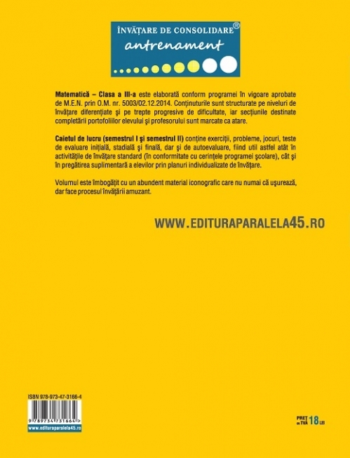 Matematică – Clasa a III-a este elaborată conform programei în vigoare aprobate de M.E.N. prin O.M. nr. 5003/02.12.2014. Conţinuturile sunt structurate pe niveluri de învăţare diferenţiate şi pe trepte progresive de dificultate, iar Secţiunile destinate completării portofoliilor elevului şi profesorului sunt marcate ca atare. Lucrarea conţine, pe lângă exerciţii şi jocuri, teste de evaluare iniţială, stadială şi finală, iar prin sugestiile metodologice moderne şi atractive face posibilă învăţarea individualizată. Îmbogăţit cu un abundent material iconografic, care nu numai că uşurează, dar face procesul învăţării amuzant, volumul include pe coperta a treia un Certificat de competenţă a învăţării, ce poate fi semnat de profesor şi se înmânează elevului la sfârşitul anului şcolar.