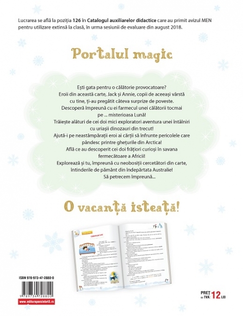 Comandă online cartea "@vacanţadeiarna.eu – Portalul Magic. Caiet de antrenament: Limba şi literatura română, Matematică. Clasa a IV-a" la 13,97 lei isbn 9789734728800 scrisă de PALEA Ana-Maria, tiparită la editura Paralela 45 face parte din colecția CAIETE DE VACANTA. cu plata ramburs sau online cu cardul. Momentan titlul "@vacanţadeiarna.eu – Portalul Magic. Caiet de antrenament: Limba şi literatura română, Matematică. Clasa a IV-a" nu este disponibil însa vă puteți înscrie pentru a fi notificat în momenul reaprovizionarii.