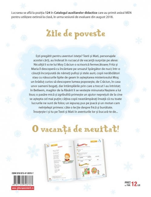 Ești pregătit pentru aventuri istețe? Texti și Mati, personajele acestei cărți, au îndesat în rucsacul de vacanță surprize pe alese: Niculiță îi scrie lui Moș Crăciun o scrisorică fermecătoare; Fritz și Maria îl descoperă cu încântare pe ursuzul Spărgător de nuci; într-o căsuță înconjurată de nămeți pufoși și stele aurii, copii nerăbdători stau cu năsucurile lipite de geam în așteptarea misteriosului Moș; un brăduț curios să descopere lumea poposește, de Crăciun, în casa unor oameni bogați, dar întâmplările prin care a trecut l-au întristat; în Betleem, magilor de la Răsărit li se vestește minunata Naștere a lui Iisus; o pasăre mică și zgribulită primește un ajutor neprețuit de la cine se aștepta cel mai puțin; câțiva copii neastâmpărați învață că nu toate lucrurile ne sunt de folos; un iepuraș pus pe joacă și un motan cam neînțelept primesc câte o lecție despre frică și bunătate.