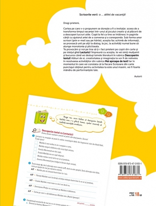 Te provocăm şi noi pe tine să ţi-i faci prieteni pe copiii din carte şi pe isteţul ghid Lecturici! Împreună cu aceştia, te vei simţi mulţumit şi bucuros când vei desluşi tainele literaturii în rubrica Descoperim textul! Alături de ei, creativitatea şi imaginaţia ta vor fi de neînvins în rezolvarea activităţilor din rubrica Mai aproape de text! Iar în momentul în care vei constata că la fiecare Scrisoare din carte punctajul obţinut pentru activitatea ta este unul maxim, vei fi foarte mândru de performanţele tale.