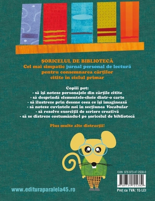 Comandă online cartea "Șoricelul de bibliotecă. Jurnal de lectură pentru copii" la 17,49 lei isbn 9789734725380 scrisă de Potter Style, tiparită la editura Paralela 45 face parte din colecția CERCUL DE LECTURA SI SCRIERE CREATIVA. cu plata ramburs sau online cu cardul. Momentan titlul "Șoricelul de bibliotecă. Jurnal de lectură pentru copii" nu este disponibil însa vă puteți înscrie pentru a fi notificat în momenul reaprovizionarii.
